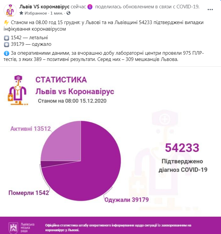 У Львівській області, станом на 08.00 год 15 грудня, 54233 підтверджені випадки інфікування коронавірусом, 1542 — летальні, 39179 — одужало.