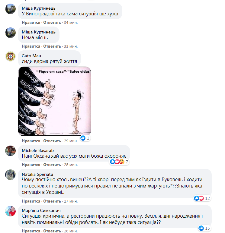 Із 145 хворих зранку на кисні знаходилося 120. Як буде далі? Напевно буде поганий кінець тому що хворі на очах задихаються, допомогти їм немає чим… А люди продовжуть масові гуляння… Я дуже б хотіла, щоб ті, які не вірять у цей коронавцірус, ті хто вважають, що це все не так, прийшли сюди і подивилися, що відбувається», – зазначила Оксана Цімбота,звертаючись до своїх земляків.