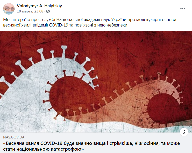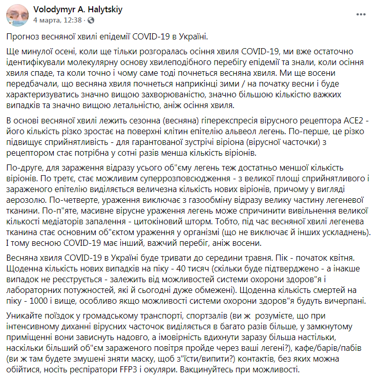 На Facebook-сторінці Володимира Галицького оприлюднено прогноз весняної хвилі епідемії COVID-19 в Україні. Очолювана ученим міжнародна група науковців ще минулої осені ідентифікувала ключові молекулярні механізми, що лежать в основі хвилеподібного перебігу пандемії COVID-19, та дійшла висновку, що весняна хвиля епідемії COVID-19 в Україні почнеться наприкінці зими – на початку весни і супроводжуватиметься вищим рівнем захворюваності, значно більшою кількістю важких випадків та значно вищою летальністю, ніж осіння хвиля.