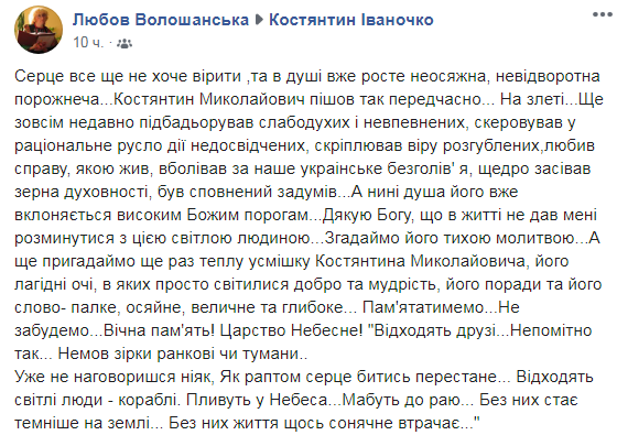 “Покійний — це зразок твердого як криця характеру, Людина з великим і щирим серцем. Для кожного з нас Кость Миколайович був прикладом людської гідності, чуйності, відданості, добропорядності та професійності. Висловлюємо щире, глибоке співчуття рідним і близьким покійного. Світла пам’ять, Царство Небесне”, – зазначається у дописі.