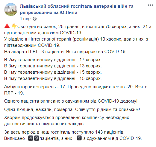 У госпіталі Винник, який став основним закладом, куди скеровують хворих з підозрою на коронавірус, помер пацієнт. Про це сьогодні, 25 травня, повідомляється на сторінці Львівського обласного госпіталю ветеранів війн та репресованих ім. Ю.Липи у ФБ.