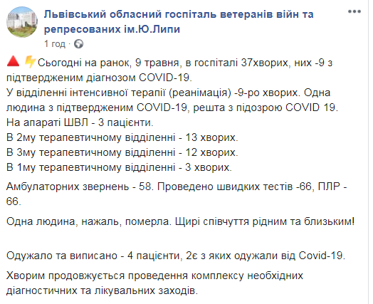 Як пише «Четверта студія», у Львівському обласному госпіталі ветеранів війн та репресованих ім.Ю.Липи повідомили, що у відділенні інтенсивної терапії (реанімація) – 9-ро хворих. Одна людина з підтвердженим COVID-19, решта з підозрою COVID-19.