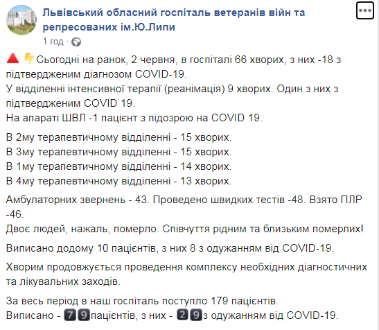 Як зазначається, сьогодні на ранок, 2 червня, в госпіталі 66 хворих, з них -18 з підтвердженим діагнозом COVID-19. У відділенні інтенсивної терапії (реанімація) 9 хворих. Один з них з підтвердженим COVID 19. На апараті ШВЛ -1 пацієнт з підозрою на COVID 19.