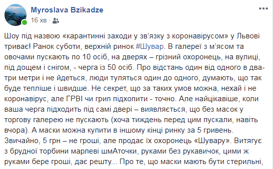 Але найцікавіше, коли ваша черга підходить під самі двері – виявляється, що без масок у торгову галерею не пускають (хоча тиждень перед цим пускали, навіть вчора). А маски можна купити в іншому кінці ринку за 5 гривень. Звичайно, 5 грн – не гроші, але продає їх охоронець «Шувару». Витягує з брудної торбини марлеві шмАточки, руками без рукавичок, цими ж руками бере гроші, дає решту… Про те, що маски мають бути стерильні, кожна запакована окремо, бо ж люди прокладають їх до обличчя – не чув. Каже, «нам їх шиють в ательє». Хто шиє, в якому ательє, коли цей «продавець» востаннє мив руки (антисептика немає і близько), невідомо.
