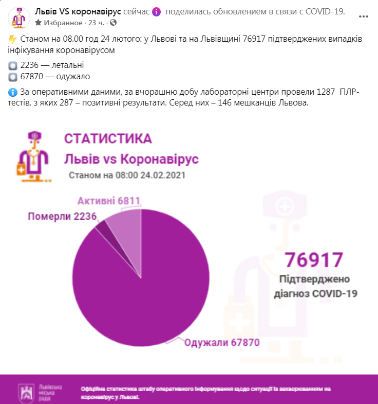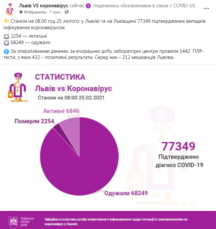 ⚡️ Станом на 08.00 год 25 лютого: у Львові та на Львівщині 77349 підтверджених випадків інфікування коронавірусом