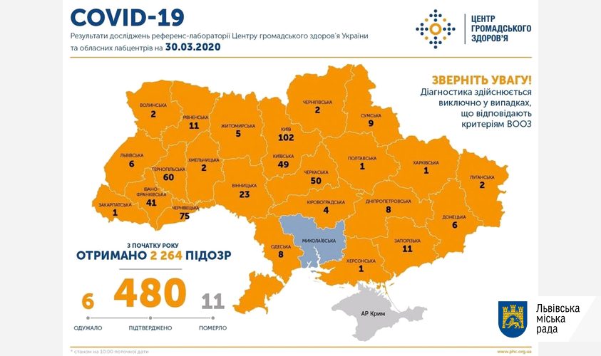 За результатами досліджень вірусологічної референс-лабораторії ЦГЗ України та обласних лабораторних центрів загалом підтверджено 480 випадків COVID-19.