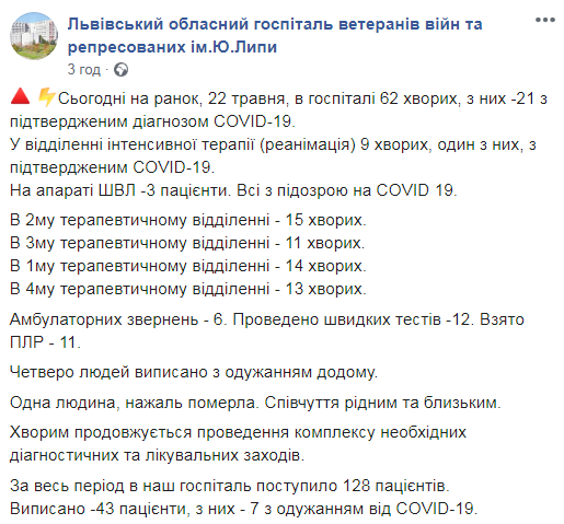 Як зазначається у повідомленні госпіталю, сьогодні на ранок, 22 травня, в госпіталі 62 хворих, з них -21 з підтвердженим діагнозом COVID-19.