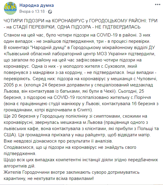 «Станом на 25 березня, було чотири підозри на СОVID-19 в районі. З них один випадок – не знайшов підтвердження, три – в процесі перевірки», – зазначається у повідомленні.
