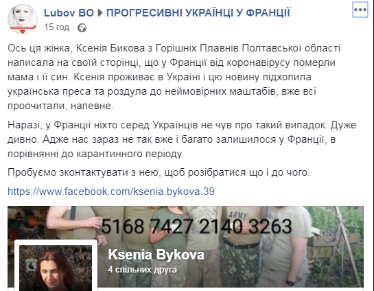 «У моїй скарбничці смертей від коронавіруса + смерть. Син моєї приятельки. Йому було 26, не пив, не курив. Успішний, молодий і красивий. Але … так, це звичайно ж змова і паніка, і порушують всі ваші права. … », – написала Ксенія Бикова в Facebook, дізнавшись про смерть хлопця.