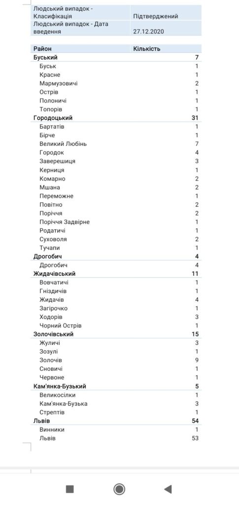 - коронавірус – перелік підтверджених випадків на Львівщині за 27 грудня 2020 року