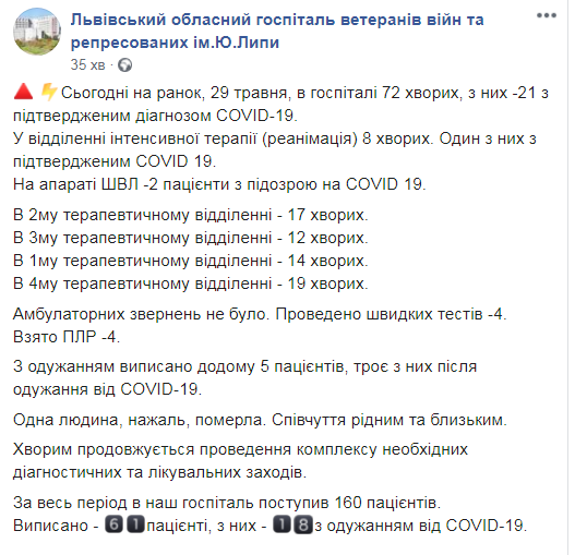 Сьогодні на ранок, 29 травня, в госпіталі 72 хворих, з них – 21 з підтвердженим діагнозом COVID-19.