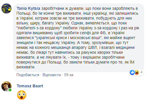 “Щось я не дуже розумію… Ще з Польщі зовсім не виїхали, а вже хочуть повертатися.”, – зазначив у коментарі під скрином із спільноти у ФБ “Українці у Польщі” Томаш Барт.