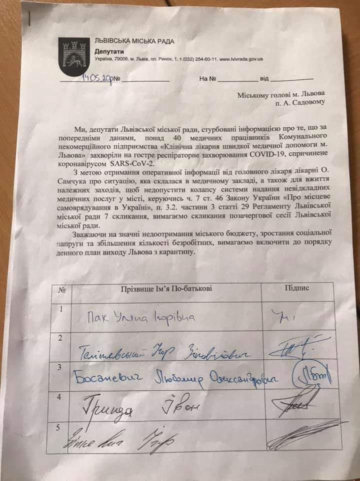 У зв’язку із ситуацією, яка склалася у Львові із захворюванням медиків на коронавірус, депутати Львівської міської ради вимагають від міського голови Львова Андрія Садового скликати позачергову сесїі, щоб “не допустити колапсу системи надання невідкладних медичних послуг у місті”.