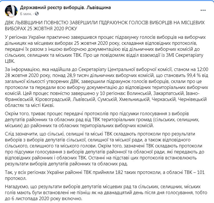 У регіонах України практично завершився процес підрахунку голосів виборців на виборчих дільницях на місцевих виборах 25 жовтня 2020 року, складання відповідних протоколів, передачі їх разом з іншою виборчою документацією від дільничних виборчих комісій до сільських, селищних та міських ТВК.
