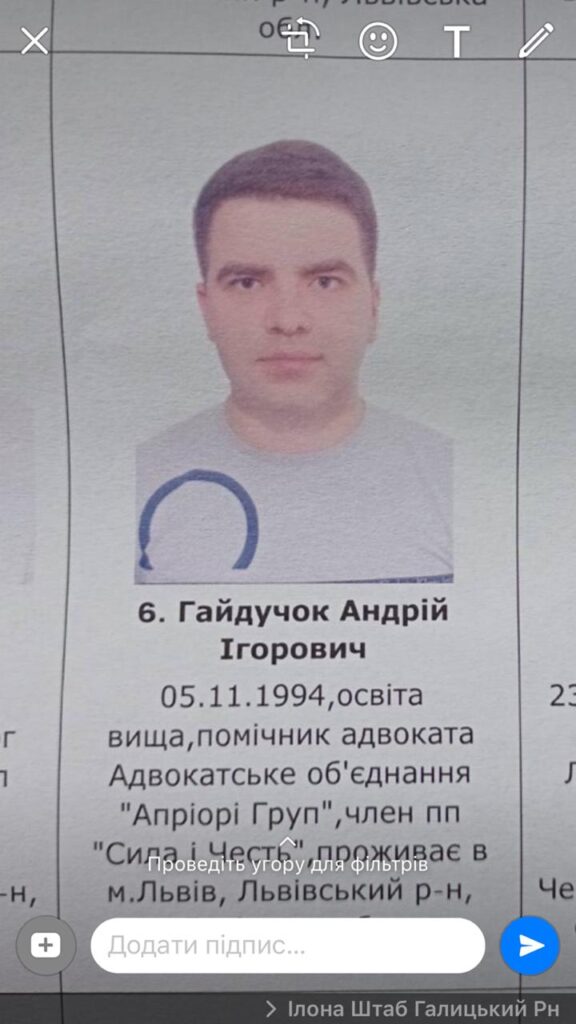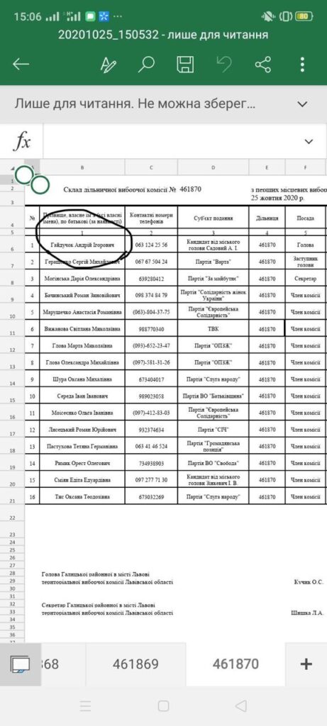 Стало відомо, що голова Дільничної виборчої комісії № 461870 Гайдучок Андрій Ігорович, який представляє кандидата на посаду міського голови Львова Андрія Садового, одночасно є кандидатом в депутати до Львівської районної ради від партії «Сила і честь».