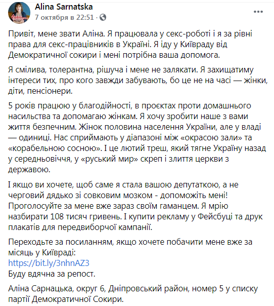 Позначки: Аліна Сарнацька, вибори, Київрада, партія “Демократична сокира”, секс-працівниця
