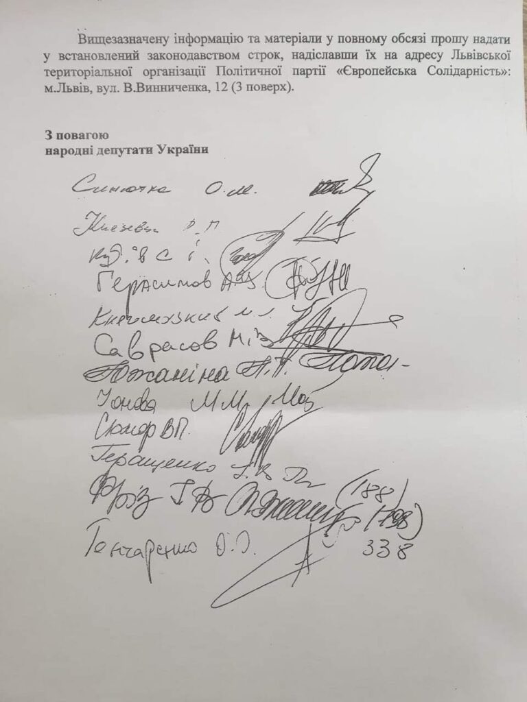 Звернення підписали народні депутати від «ЄС» Олег Синютка, Руслан Князевич, Артур Герасимов, Степан Кубів, Микола Княжицький, Максим Саврасов, Ніна Южаніна, Марія Іонова, Вікторія Сюмар, Ірина Геращенко, Ірина Фріз, Олексій Гончаренко.
