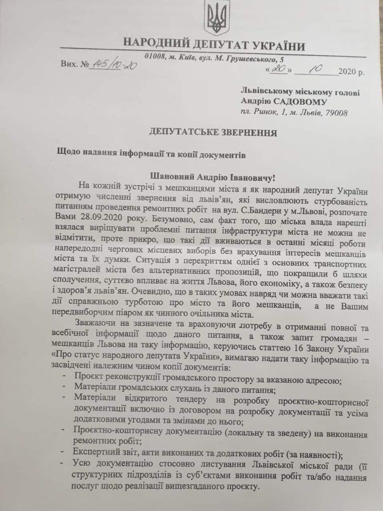 12 народних депутатів з фракції «Європейська Солідарність» підписали звернення до Львівського міського голови Андрія Садового з вимогою надати інформацію та копії документів щодо проведення ремонтних робіт на вулиці Степана Бандери у Львові.