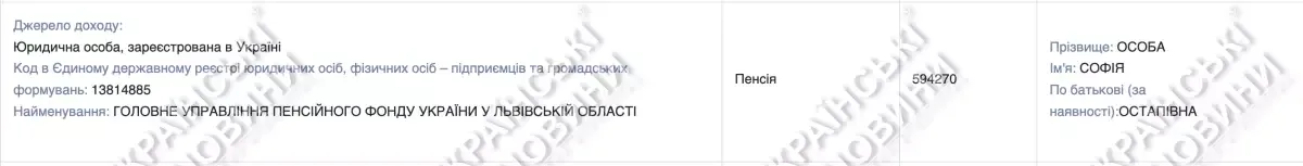 Донька Ірини Фаріон Софія, ймовірно, вийшла на пенсію у 36 років та отримала за рік 600 тис. гривень пенсійних виплат.