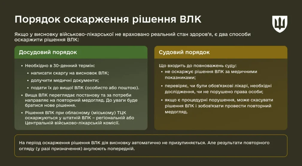 Якщо не влаштовує рішення ВЛК при обласному (міському) ТЦК, його можна оскаржити у штатній ВЛК – регіональній або Центральній військово-лікарській комісії.