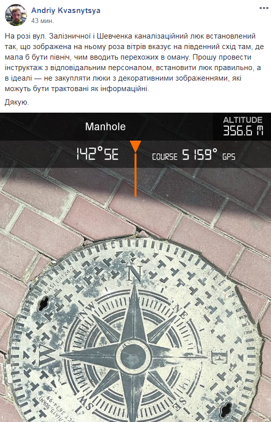 У Львові, на розі вул. Залізничної і Шевченка, каналізаційний люк встановлений так, що зображена на ньому роза вітрів вказує на південний схід там, де мала б бути північ, чим вводить перехожих в оману.