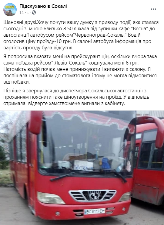 Я попросила вказати мені на прейскурант цін, оскільки вчора така сама поїздка рейсом “Львів – Сокаль” коштувала мені 6 грн. Натомість, водій почав мене принижувати і виганяти з салону. Я поспішала на прийом до стоматолога і тому не могла відмовитися від поїздки. Пізніше я звернулася до диспетчера Сокальської автостанції з проханням пояснити таке ціноутворення на проїзд. У відповідь отримала відверте хамство: мене вигнали з кабінету»,- зазначається на сторінці спільноти «Підслухано в Сокалі» у ФБ.