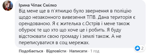 Як зазначається, територія, на якій були скинуті тверді побутові відходи, орендована, а сміття грейдерами було розгорнуте і переміщене в технічне озеро, яке знаходиться на території колишньої АЗС. Як зазначила староста села Острів Ірина Чіпак, орендарі вже звернулись із заявою в поліцію.