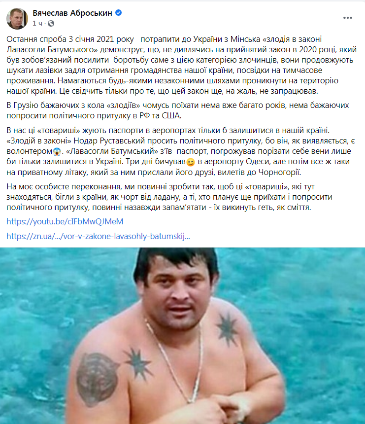 «Остання спроба 3 січня 2021 року потрапити до України з Мінська «злодія в законі Лавасогли Батумського» демонструє, що, не дивлячись на прийнятий закон в 2020 році, який був зобов’язаний посилити боротьбу саме з цією категорією злочинців, вони продовжують шукати лазівки задля отримання громадянства нашої країни, посвідки на тимчасове проживання. Намагаються будь-якими незаконними шляхами проникнути на територію нашої країни. Це свідчить тільки про те, що цей закон ще, на жаль, не запрацював.