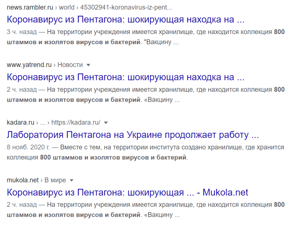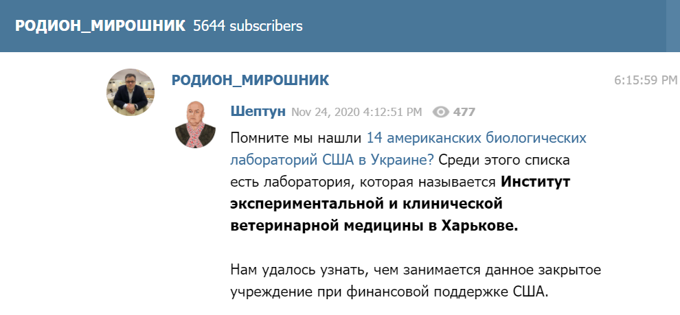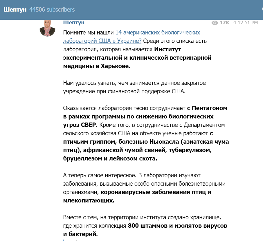 Так відбувається і з остогидлим фейком про американські біолабораторії на території України, який запустили в інфопростір України два «брати-акробати» з минулого — Віктор Медведчук та Ренат Кузьмін. Цей фейк було детально розібрано в публікації на сайті «Петро і Мазепа» ще у квітні цього року. Невдовзі фейк розібрала на молекули й журналістка «Детектора медіа» Гала Скляревська.