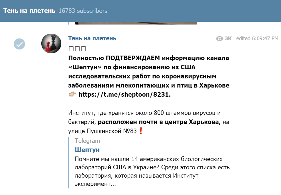 Протягом наступних чотирьох годин нову казочку перепостили телеграм-канали проросійського пулу в Україні: «Ivko.Live», «цибуля», «Тень на плетень», колишній нардеп від Партії регіонів, а нині постійний гість російських пропагандистських телеканалів Родион Мирошник, а також один із генералів пропагандистських військ «СОЛОВЬЁВ».