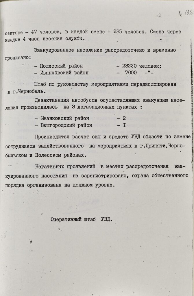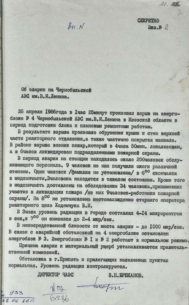 Державний архів Служби безпеки України публікує секретні документи КДБ: найпершу доповідь «наверх» про вибух від директора ЧАЕС Віктора Брюханова, переговори операторів станції в момент аварії, евакуація майже 45 тис. жителів Прип’яті та прилеглих районів.