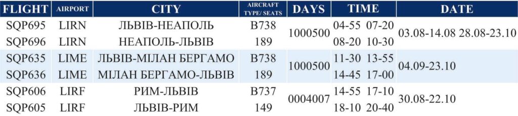 Як зазначається, у понеділок виліт зі Львова 4 год. 55 хв, приліт до Неаполя 7 год. 20 хв.
