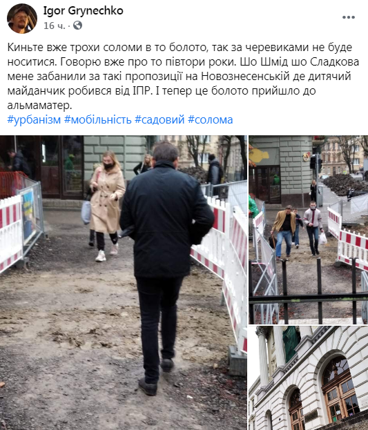 «Киньте вже трохи соломи в то болото, так за черевиками не буде носитися. Говорю вже про то півтори роки. Що Шмід, що Сладкова мене забанили за такі пропозиції на Новознесенській де дитячий майданчик робився від ІПР. І тепер це болото прийшло до альма-матер»,- зазначив у дописі на сторінці спільноти «Львів без корків» у ФБ Igor Grynechko.