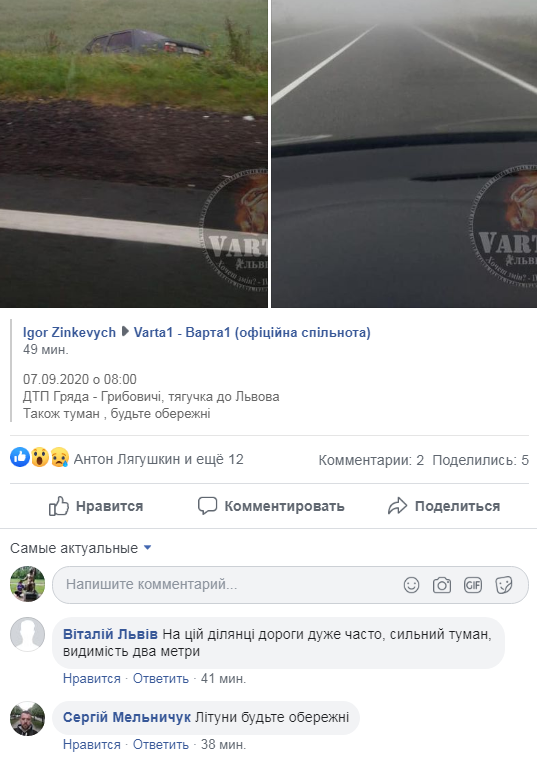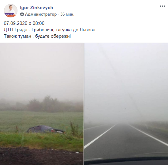 “ДТП Гряда – Грибовичі, тягучка до Львова. Також туман, будьте обережні”, – зазначає Зінкевич.