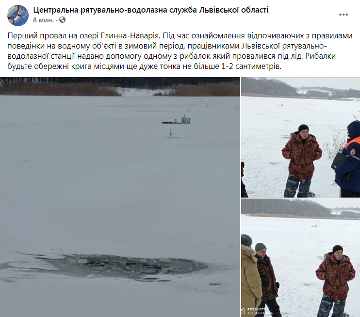 «Перший провал на озері Глинна-Наварія. Під час ознайомлення відпочиваючих з правилами поведінки на водному об’єкті в зимовий період, працівниками Львівської рятувально-водолазної станції надано допомогу одному з рибалок який провалився під лід. Рибалки будьте обережні крига місцями ще дуже тонка не більше 1-2 сантиметрів», – зазначається у повідомленні.