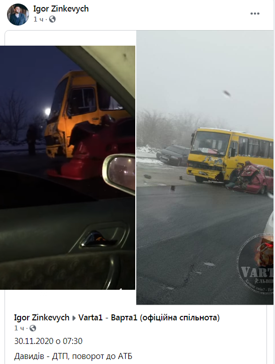 «30.11.2020 о 07:30. Давидів – ДТП, поворот до АТБ», – зазначається у коментарі до відео та світлини з місця події.