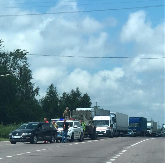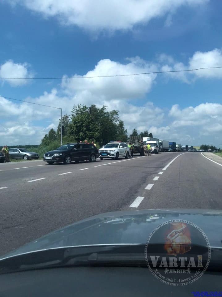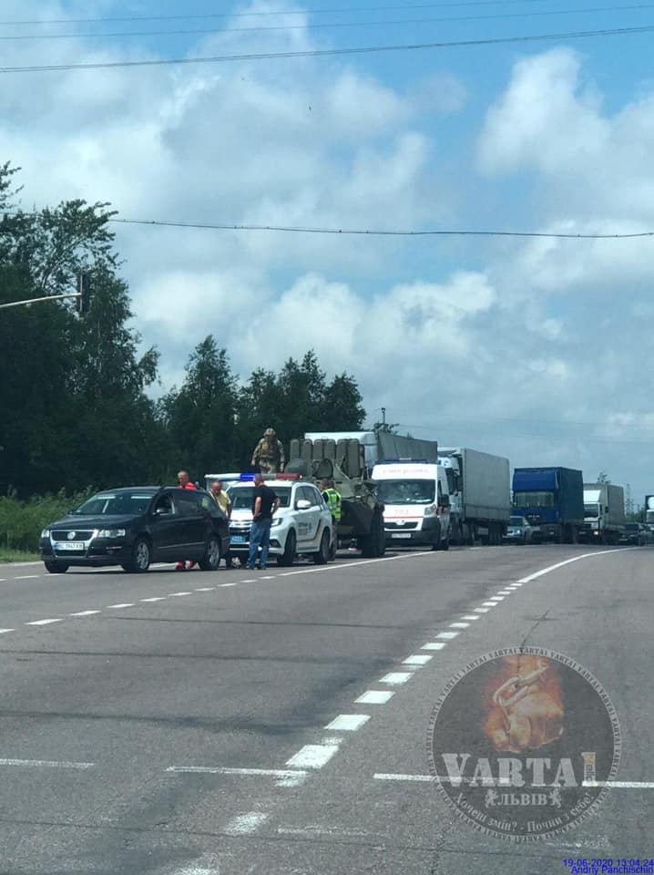 “19.06.2020 о 12:30, кільцева дорога Львова, перехрестя Скнилів – Басівка, колона з військовими, БТР догнав Вольцваген – Ускладнення а русі”, – зазначає у дописі до світлин з місця події Ігор Зінкевич.