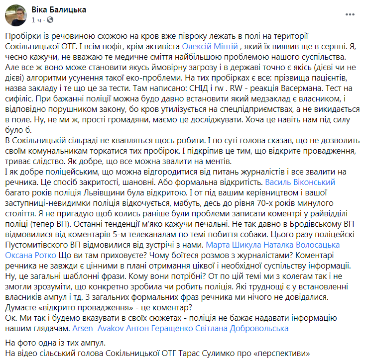 «Я, чесно кажучи, не вважаю те медичне сміття найбільшою проблемою нашого суспільства. Але все ж воно може становити якусь ймовірну загрозу і в державі точно є якісь (дієві чи не дієві) алгоритми усунення такої еко-проблеми. На тих пробірках є все: прізвища пацієнтів, назва закладу і те що це за тести. Там написано: СНІД і rw . RW – реакція Васермана. Тест на сифіліс. При бажанні поліції можна будо давно встановити який медзаклад є власником, і відповідно порушником закону, бо кров утилізується на спецпідприємствах, а не викидається в поле. Ну, не ми ж, прості громадяни, маємо це досліджувати. Хоча це навіть нам під силу було б»,- зазначається у дописі.