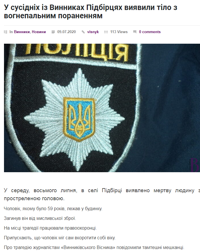 На Львівщині восьмого липня, в селі Підбірці, виявлено мертву людину з простреленою головою. Чоловік, якому було 59 років, лежав у будинку.