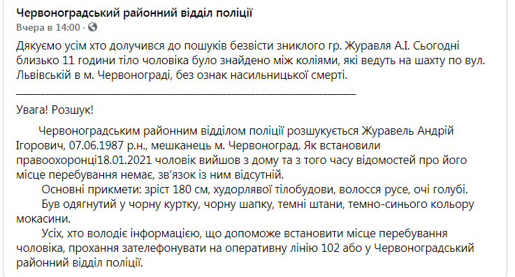 «Дякуємо усім хто долучився до пошуків безвісти зниклого гр. Журавля А.І. 4 лютого близько 11 години тіло чоловіка було знайдено між коліями, які ведуть на шахту по вул. Львівській в м. Червонограді, без ознак насильницької смерті», – зазначається у повідомленні.