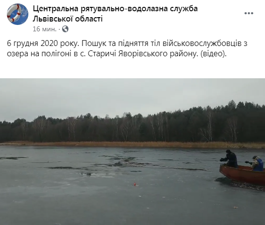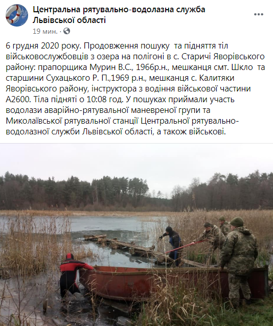 Як повідомляє Центральна рятувально-водолазна служба Львівської області у ФБ, «6 грудня 2020 року. Продовження пошуку та підняття тіл військовослужбовців з озера на полігоні в с. Старичі Яворівського району: прапорщика Мурин В.С., 1966р.н., мешканця смт. Шкло та старшини Сухацького Р. П.,1969 р.н., мешканця с. Калитяки Яворівського району, інструктора з водіння військової частини А2600. Тіла підняті о 10:08 год. У пошуках приймали участь водолази аварійно-рятувальної маневреної групи та Миколаївської рятувальної станції Центральної рятувально-водолазної служби Львівської області, а також військові».