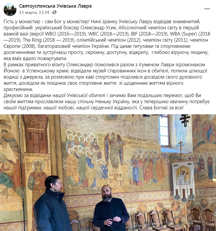 «Гість у монастир – сам Бог у монастир! Нині зранку Унівську Лавру відвідав знаменитий, професійний український боксер Олександр Усик. Абсолютний чемпіон світу в першій важкій вазі (версії WBO (2016—2019), WBC (2018—2019), IBF (2018—2019), WBA (Super) (2018—2019), The Ring (2018 — 2019), олімпійський чемпіон (2012), чемпіон світу (2011), чемпіон Європи (2008), багаторазовий чемпіон України. Під цими титулами та спортивними досягненнями ти зустрічаєш просту, скромну, доступну, відкриту, глибоко віруючу людину, яка вміє вдало пожартувати.
