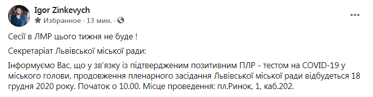 Як пише «Четверта студія», депутат Львівської міської ради Ігор Зінкевич, з посиланням на Секретаріат Львівської міської ради, повідомив, що «у зв’язку із підтвердженим позитивним ПЛР – тестом на COVID-19 у міського голови, продовження пленарного засідання Львівської міської ради відбудеться 18 грудня 2020 року. Початок о 10.00. Місце проведення: пл.Ринок, 1, каб.202».