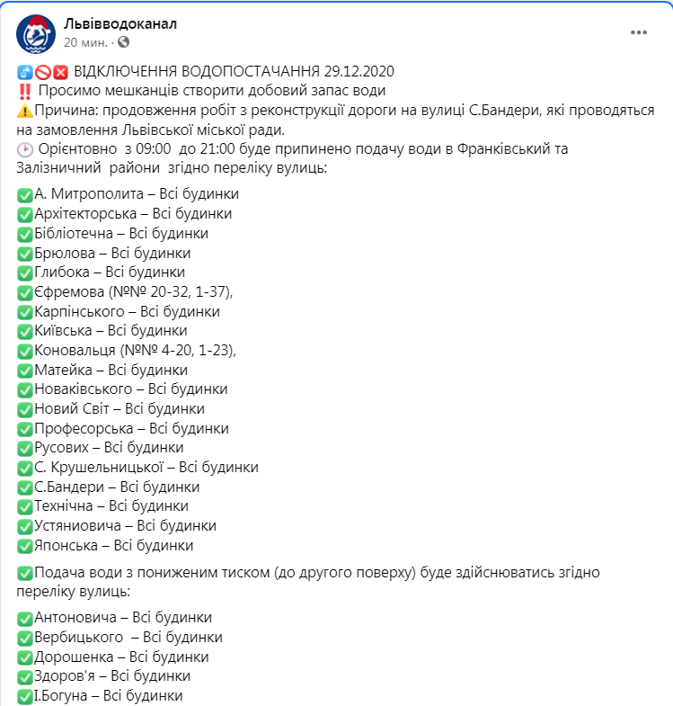 Як зазначається у повідомленні, орієнтовно з 09:00 до 21:00 буде припинено подачу води в Франківський та Залізничний райони згідно переліку вулиць: