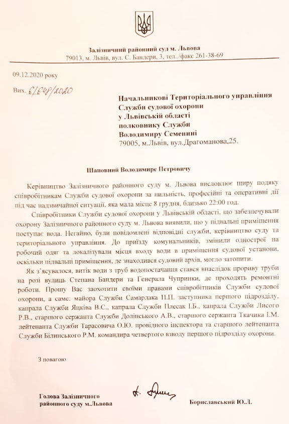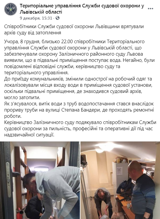 Як пише «Четверта студія» у Територіальному управлінні Служби судової охорони у Львівській області повідомили, що 8 грудня, близько 22.00 співробітники Територіального управління Служби судової охорони у Львівській області, що забезпечували охорону Залізничного районного суду Львова виявили, що в підвальні приміщення поступає вода. Негайно, були повідомлені відповідні служби, керівництво суду та територіального управління.