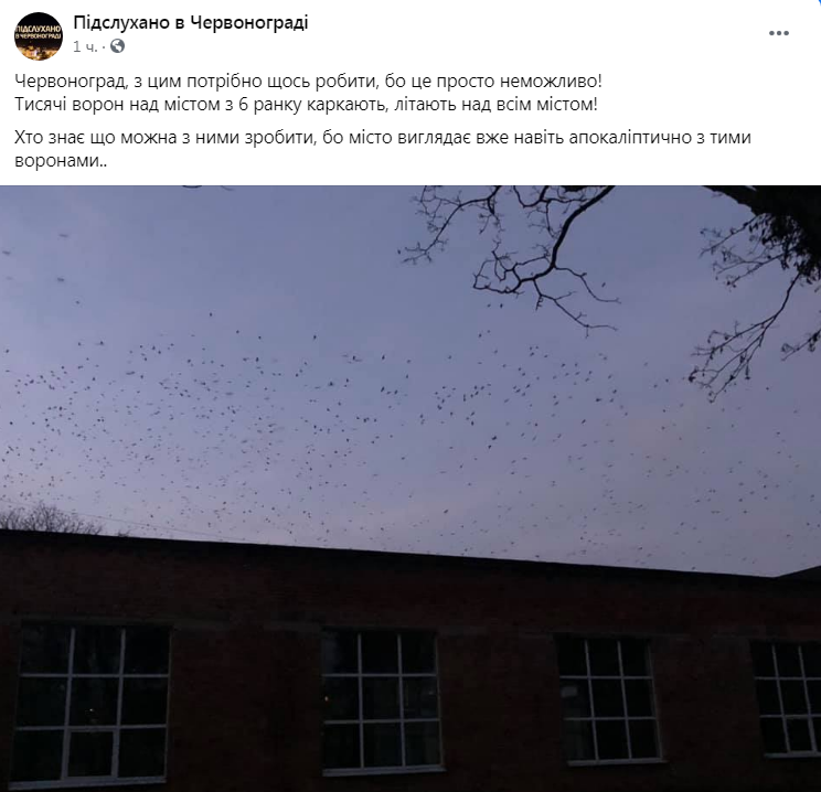 «Червоноград, з цим потрібно щось робити, бо це просто неможливо! Тисячі ворон над містом з 6 ранку каркають, літають над всім містом! Хто знає що можна з ними зробити, бо місто виглядає вже навіть апокаліптично з тими воронами…»,- зазначається у коментарі до світлини.