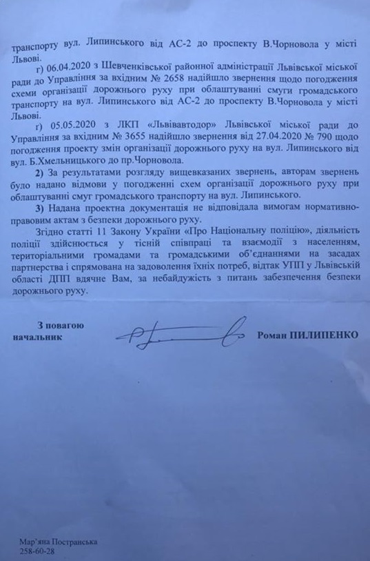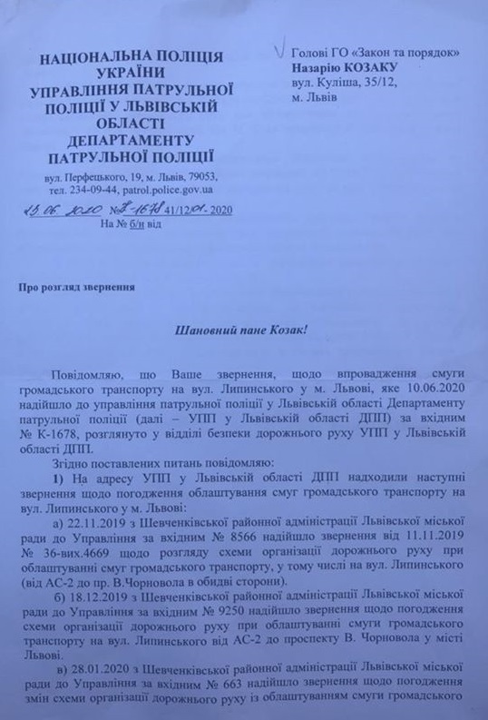 Управління патрульної поліції у Львівській області надало відповідь на звернення Голови ГО “Закон та порядок” щодо смуги громадського транспорту по вулиці Липинського у Львові.
