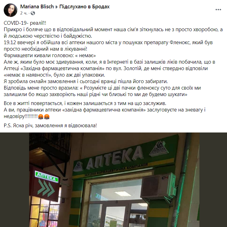 Все в житті повертається, і кожен залишається з тим на що заслужив. А ви, працівники аптеки «Західна фармацевтична компанія» заслуговуєте на зневагу і недовіру! Ясна річ, замовлення я відвоювала!»,- зазначається у дописі Mariana Blisch на сторінці спільноти Підслухано в Бродах.