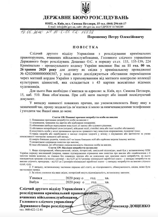 У зв’язку з цим повідомляємо Порошенка П.О. про необхідність з’явитися до Державного бюро розслідувань об 11:00 26 травня 2020 року на допит у якості свідка”, – йдеться у повістці.