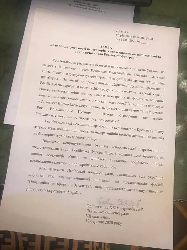 «Розцінюємо такі неофіційні перемовини з керівництвом Кремля, як пряму загро територіальній цілісності та інформаційній безпеці держави, як перехід на бік ворога в умовах воєнного стану. Закликаємо усіх українців засудити такі анти державницькі політичні дії представників «Опозиційна платформа – За життя», щоб продемонструвати нашу єдність та рішучість у боротьбі за Україну», – зазначається у тексті заяви депутатів Львівської обласної ради.